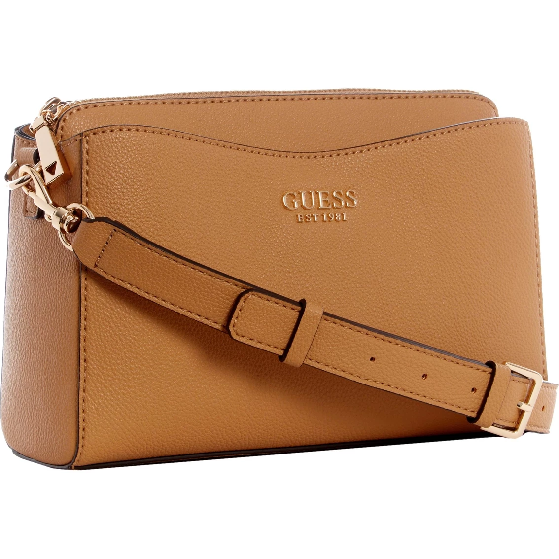 The Guess Lyndi Crossbody features a center zip triple entry and open side compartments along with interior pockets. Perfect for the Guess girl on the go. Style: AG776114BEI.