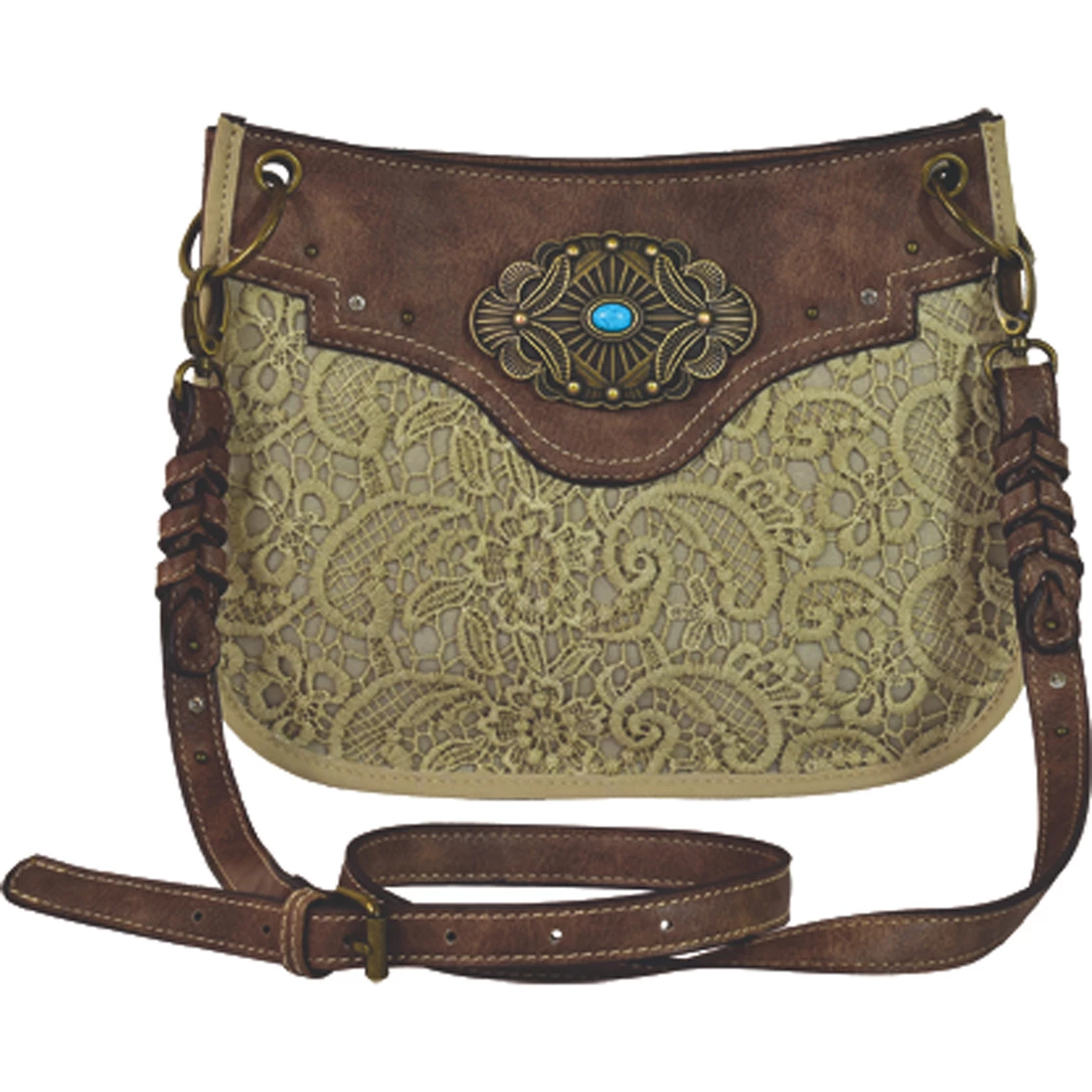 The Justin crossbody comes in brown with lace and antique brass concho with turquoise. The bag has rhinestone and metal studs, 1 compartment, 2 organizational pockets, 1 zip pocket, 1 back zip pocket, adjustable shoulder strap and a magnetic top closure. Style: 2116599.