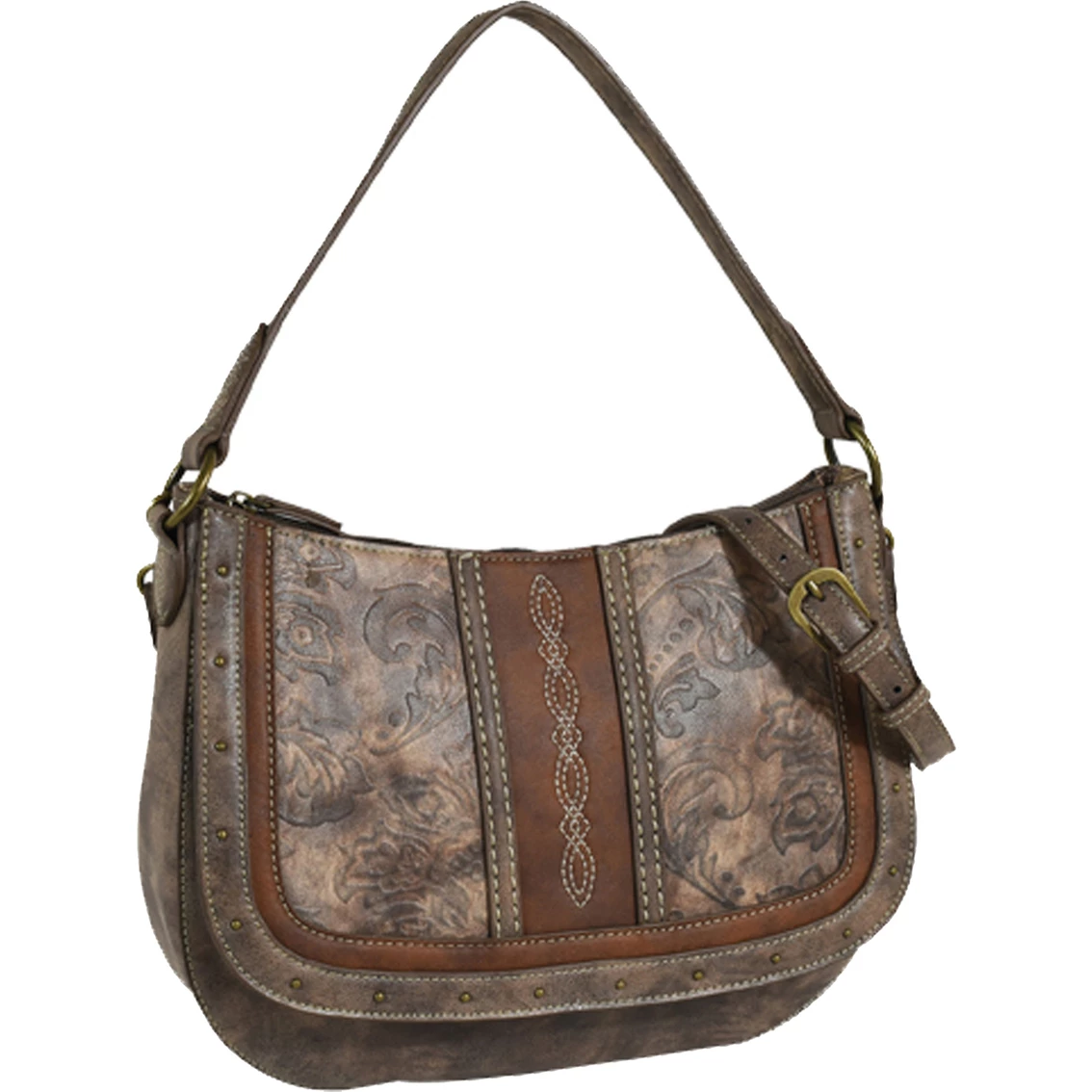 This brown lace crossbody purse from Justin adds a western touch to your look with its anti-brass concho, turquoise, rhinestone and metal stud detailing. Other features include dual concealed carry pockets, one compartment, two organizational pockets, one zip pocket, one open slot pocket under the flap, semi adjustable shoulder strap, zip top closure and magnetic snap flap closure. This bag is crafted from faux leather. Style: 2116594.