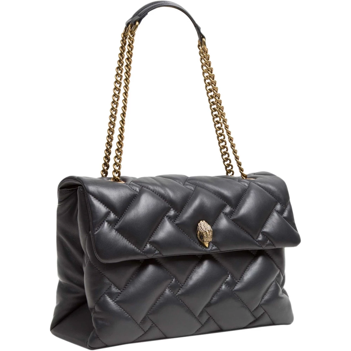 Large in size and style, the Kurt Geiger Kensington Soft XXL Purse is stitched in a black quilted leather with iconic eagle head emblem on the flap in gold. The chain strap sits on the shoulder in brushed gold with leather panels for comfort. Style: 4708500109.
