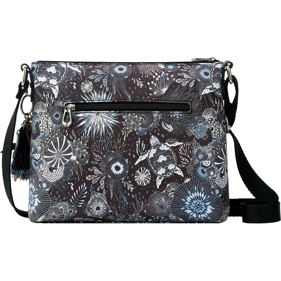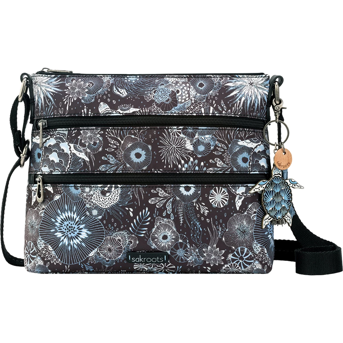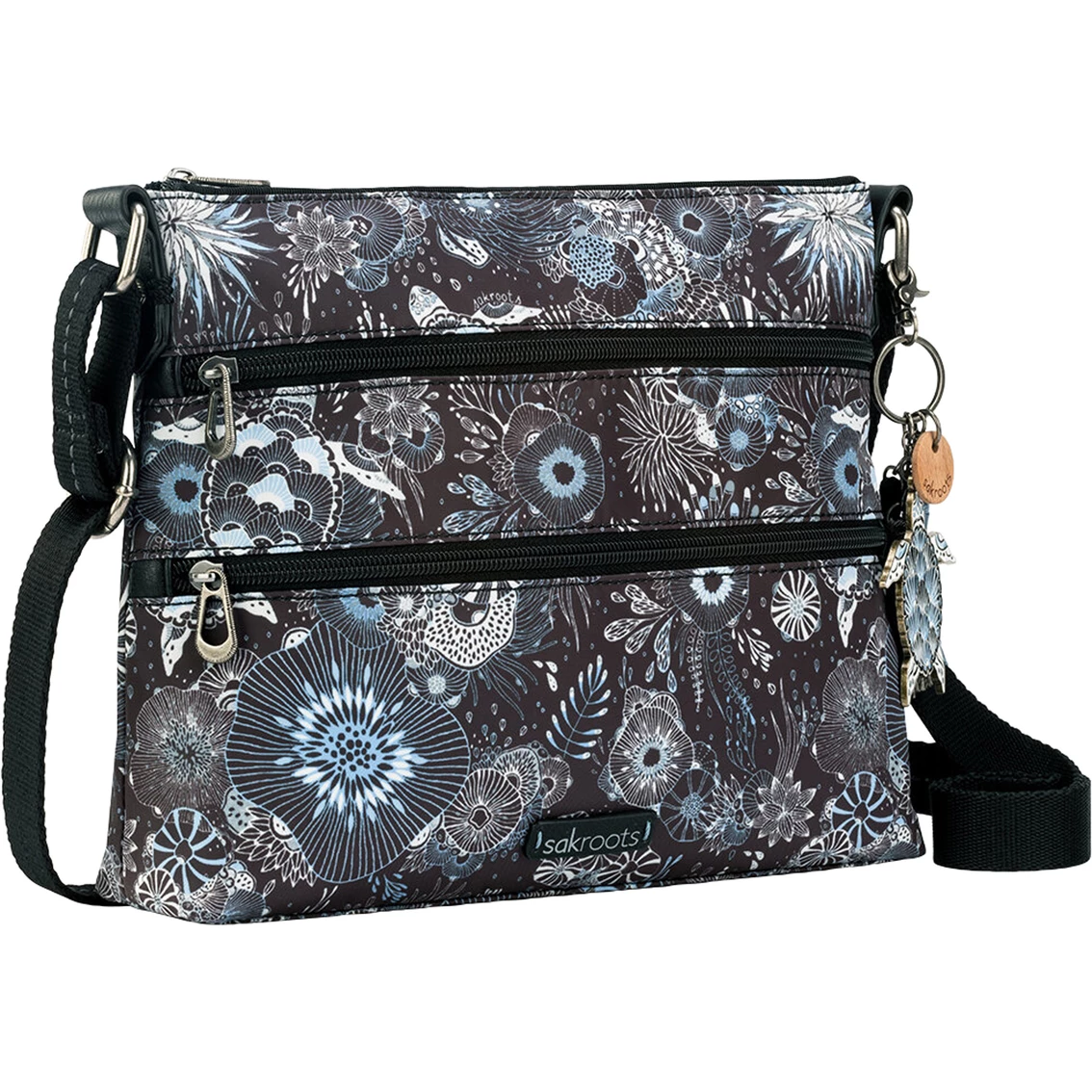 The top-selling Sakroots Artist Circle Basic Crossbody is crafted from eco-friendly Eco-Twill material, made from recycled materials including 4 plastic bottles. Sustainable, durable, and water-repellant. Two front zipper pockets and one back zipper pocket. Interior contains a back wall zipper pocket and two front wall multi-functional pockets. Main Zipper Closure. Style: 108778MDNGHTSS.