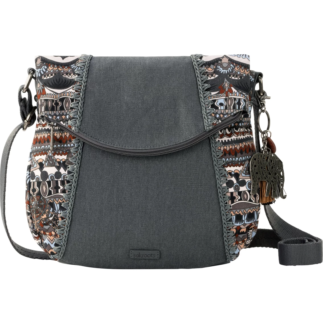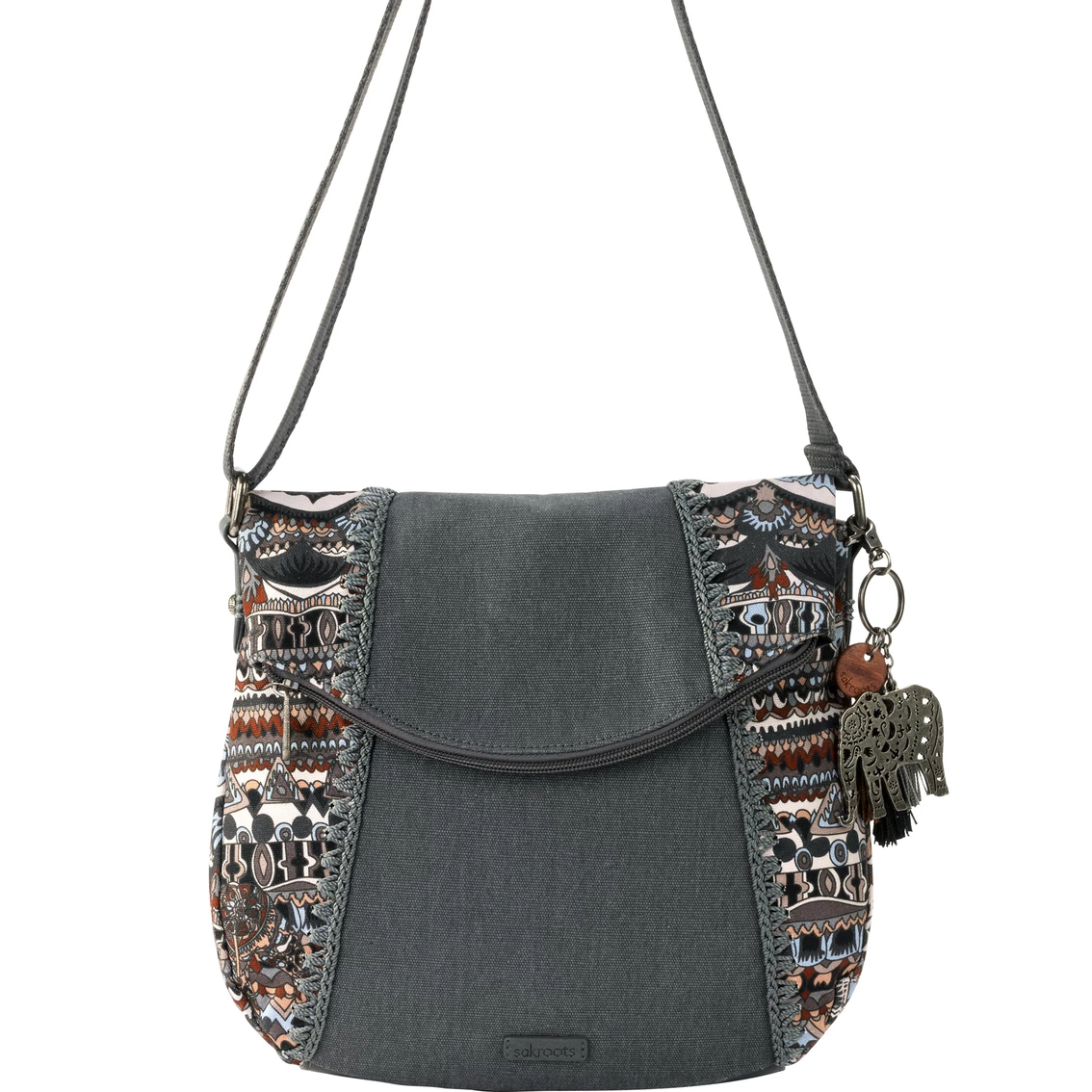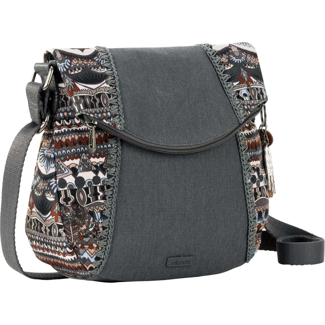 Perfect for going hands free around town, this Sakroots crossbody travels with you everywhere. Its roomy interior stashes all your essentials while vivid prints and a removable critter keychain add plenty of style. This bag has antique silvertone hardware, a magnetic snap closure, a flap zipper compartment and a back zipper pocket. The interior contains a back wall zipper pocket and two front wall multi-functional pockets. Style: 106495GRYOW.