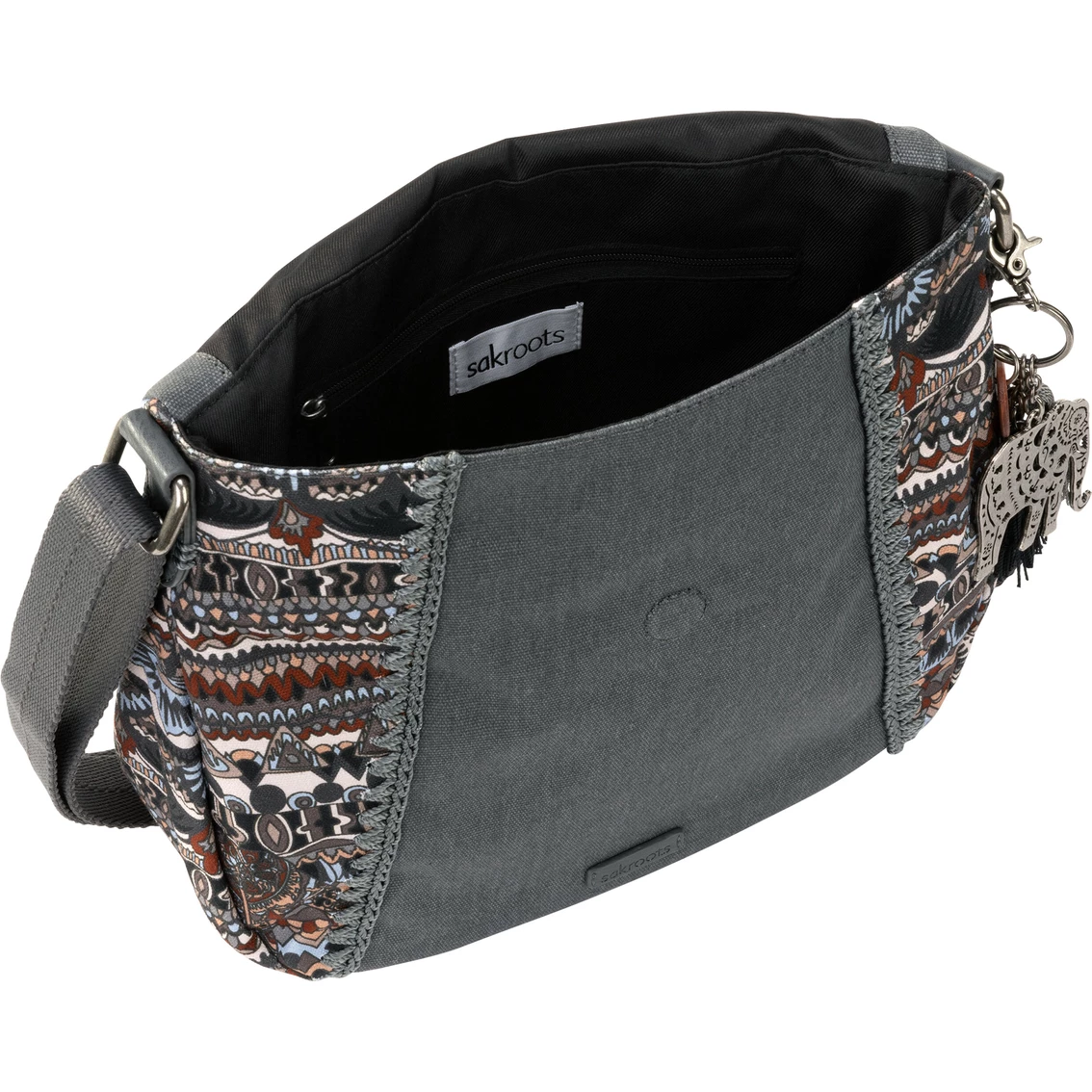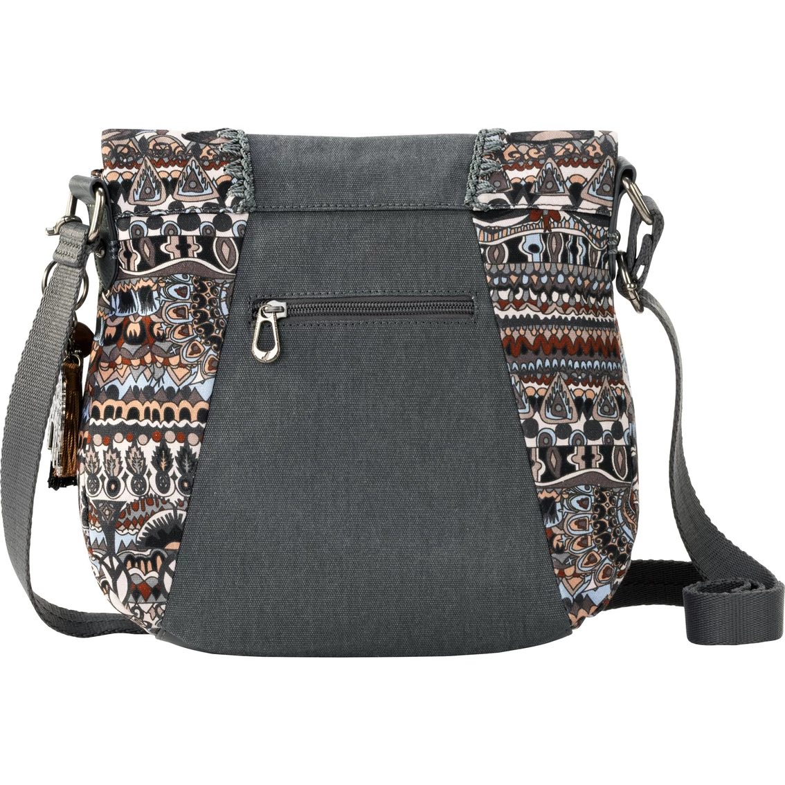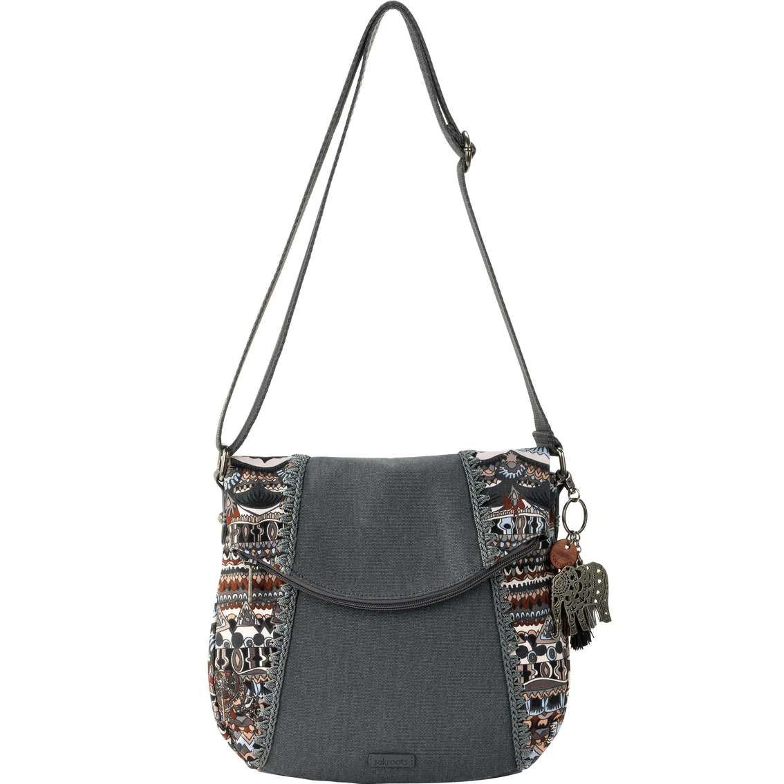 Perfect for going hands free around town, this Sakroots crossbody travels with you everywhere. Its roomy interior stashes all your essentials while vivid prints and a removable critter keychain add plenty of style. This bag has antique silvertone hardware, a magnetic snap closure, a flap zipper compartment and a back zipper pocket. The interior contains a back wall zipper pocket and two front wall multi-functional pockets. Style: 106495GRYOW.