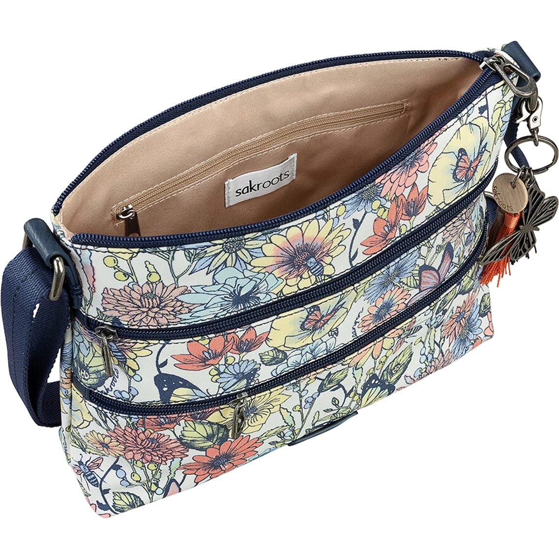 Hands-free and super functional, this Sakroots crossbody is made from sustainable materials featuring cast in intricate prints. It features lots of pockets and a zip top closure to keep everything neat and secure. This bag also comes with antique silvertone hardware, a main zipper closure, two front zipper pockets and one back zipper pocket. The interior contains a back wall zipper pocket and two front wall multi-functional pockets. Style: 107214.