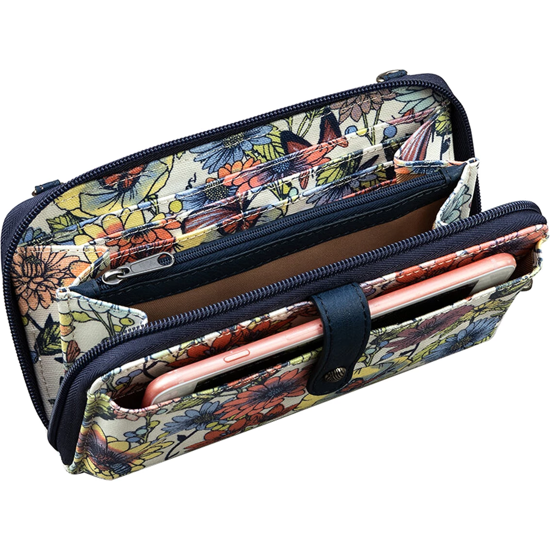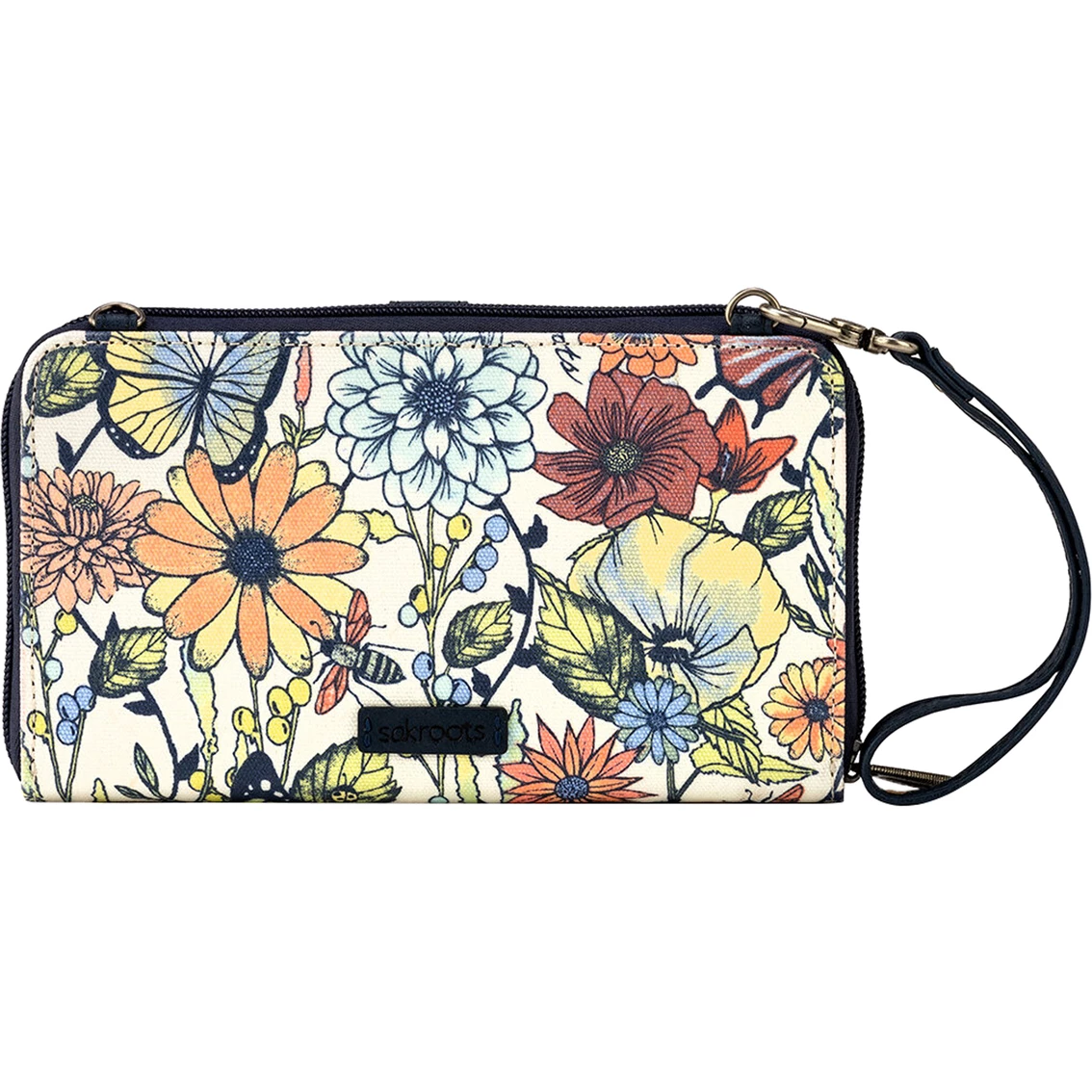 The Sakroots Large Smartphone Crossbody stylishly stows your smartphone (up to an iPhone Xs Max). The front phone pocket securely holds your phone, and interior compartments organize your essentials. Wear it as a wallet, wristlet or crossbody with the detachable strap. Other features include a main zipper closure and a front pocket with a pin snap closure. The interior contains 16 credit card slots, bill pockets and a zipper pocket. Style: 108055MLTIB.