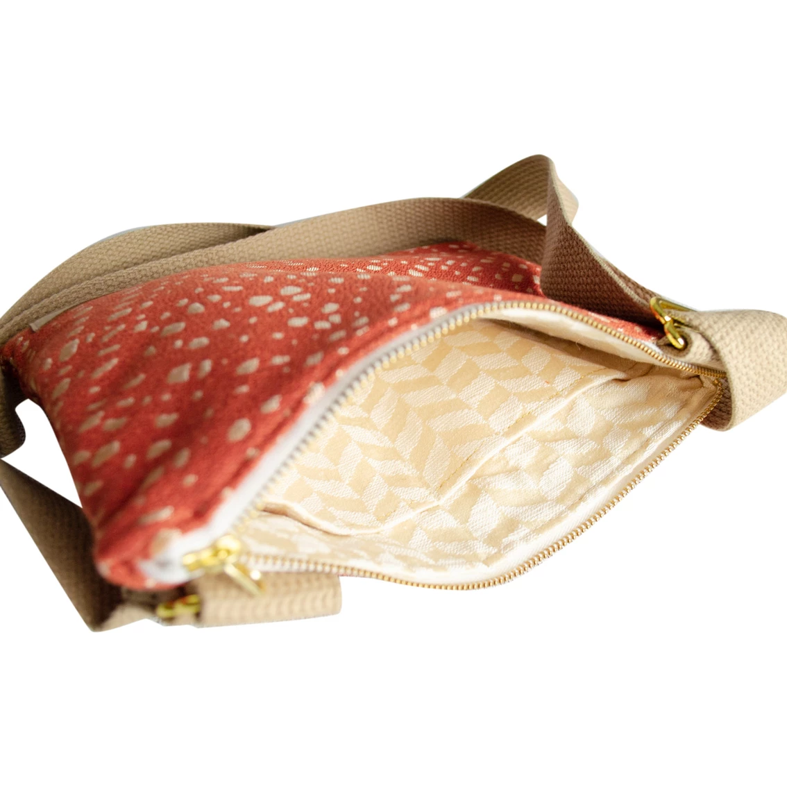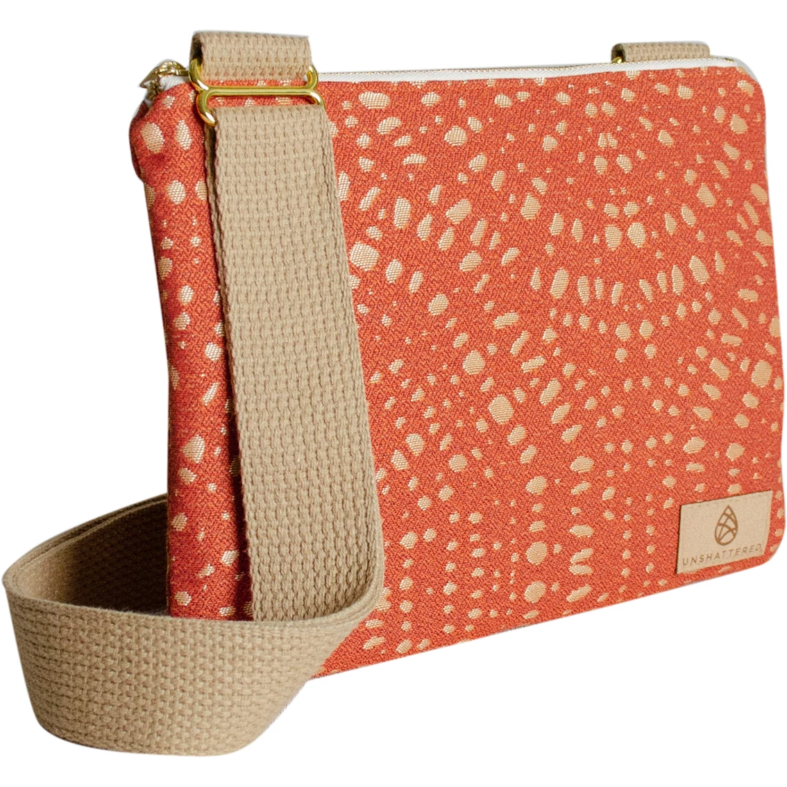 This slim profile crossbody pouch from Unshattered is handcrafted out of 100% upcycled materials in the USA by a woman winning her battle against addiction. The bag is designed featuring sophisticated reclaimed fabric with a dotted burnt orange pattern.