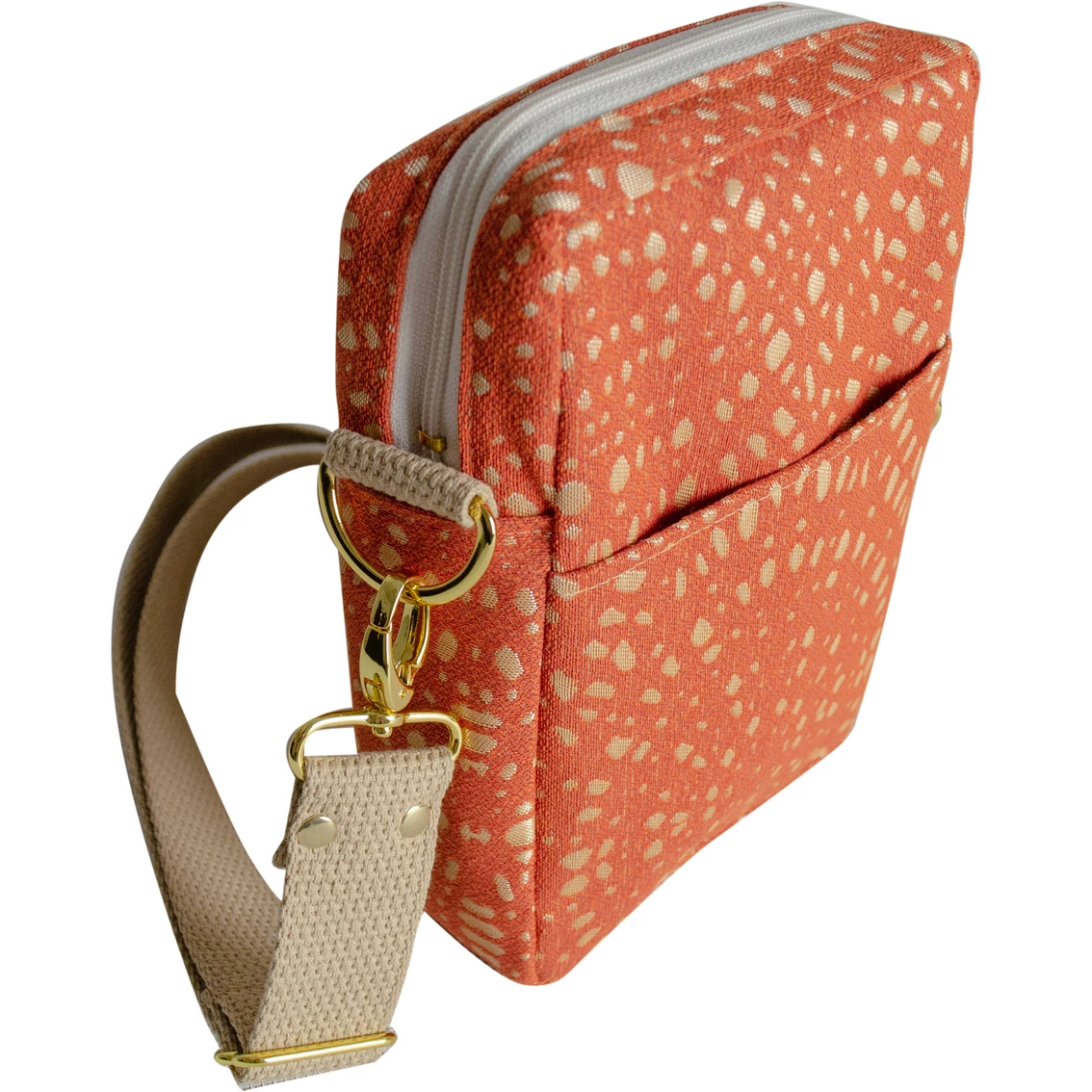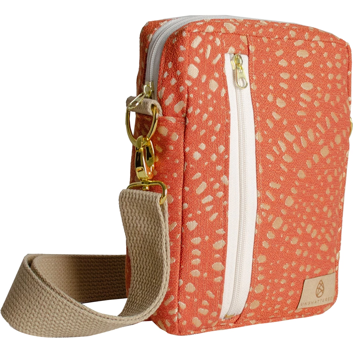 This errand bag from Unshattered is handcrafted out of 100% upcycled materials in the USA by a woman winning her battle against addiction. It is designed featuring sophisticated reclaimed fabric with a dotted burnt orange pattern.
